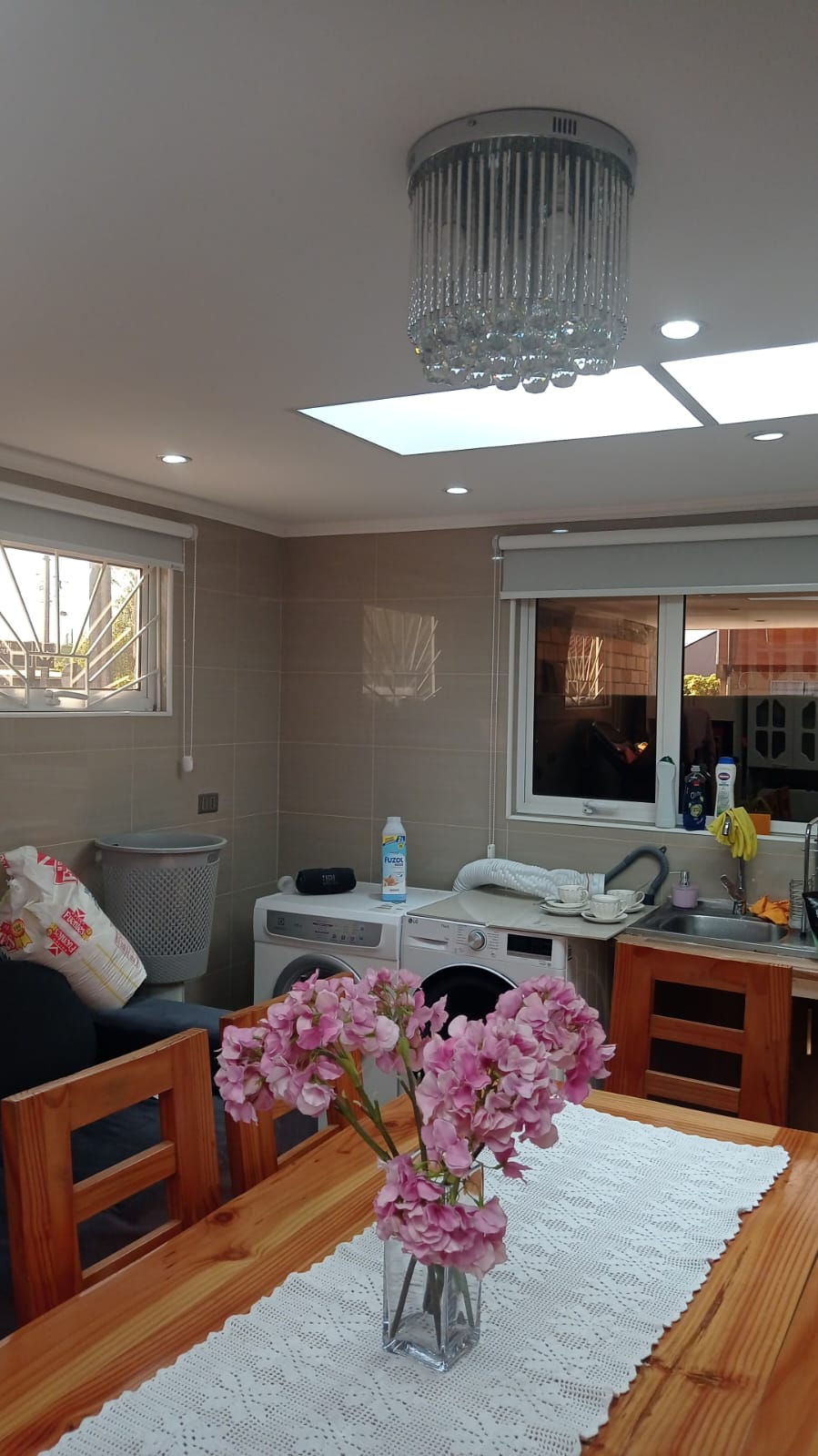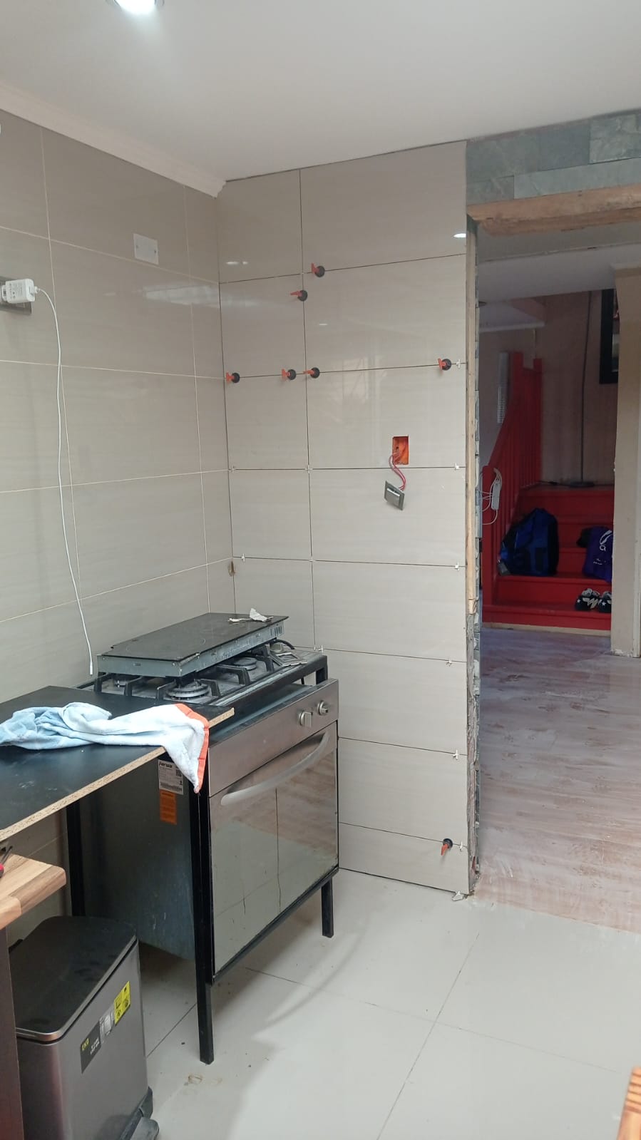 Cocina con revestimiento blanco rectangular y piso beige gran formato terminado