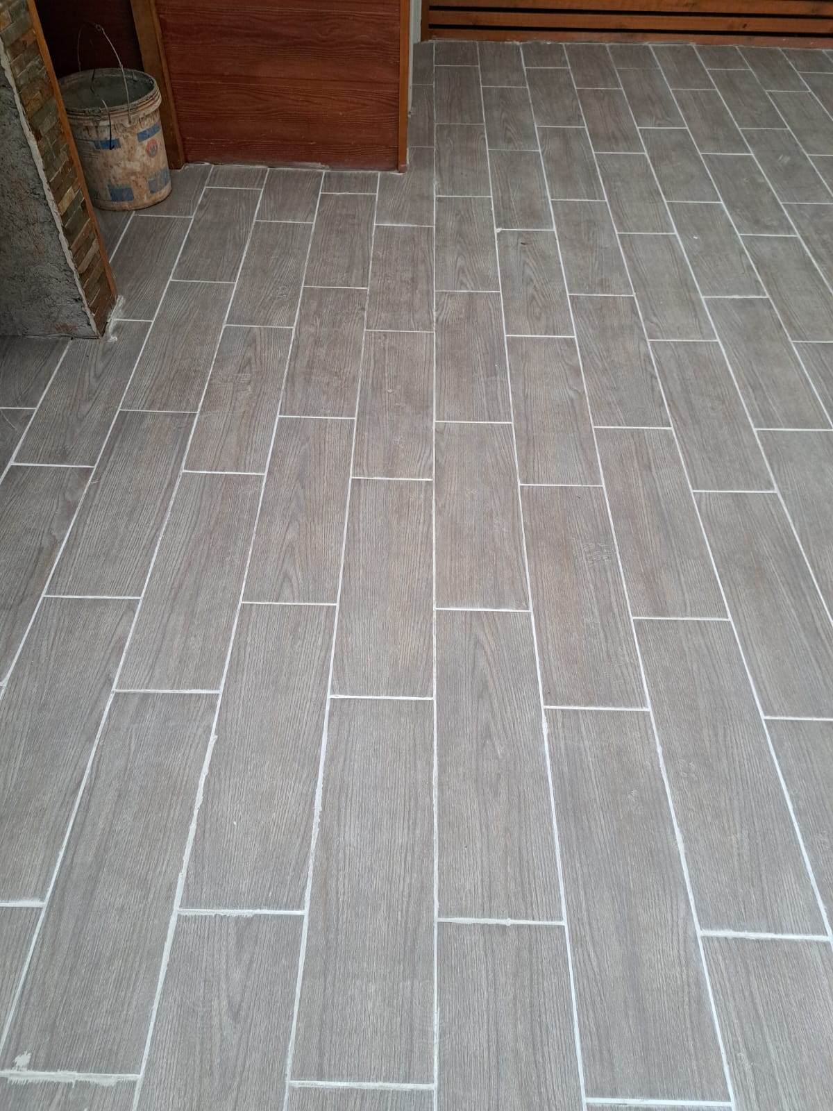 Porcelanato símil madera gris en patrón diagonal con niveladores profesionales