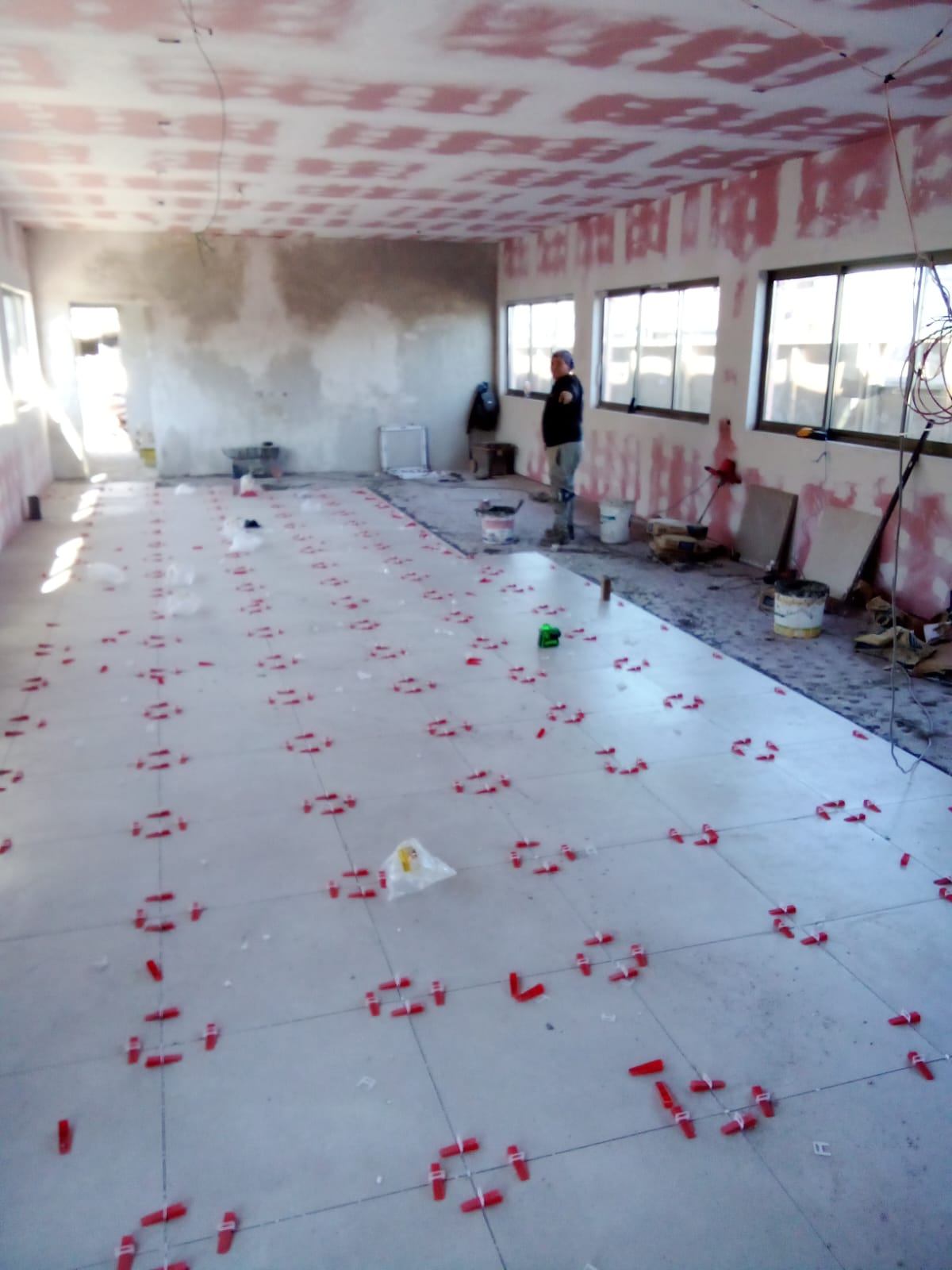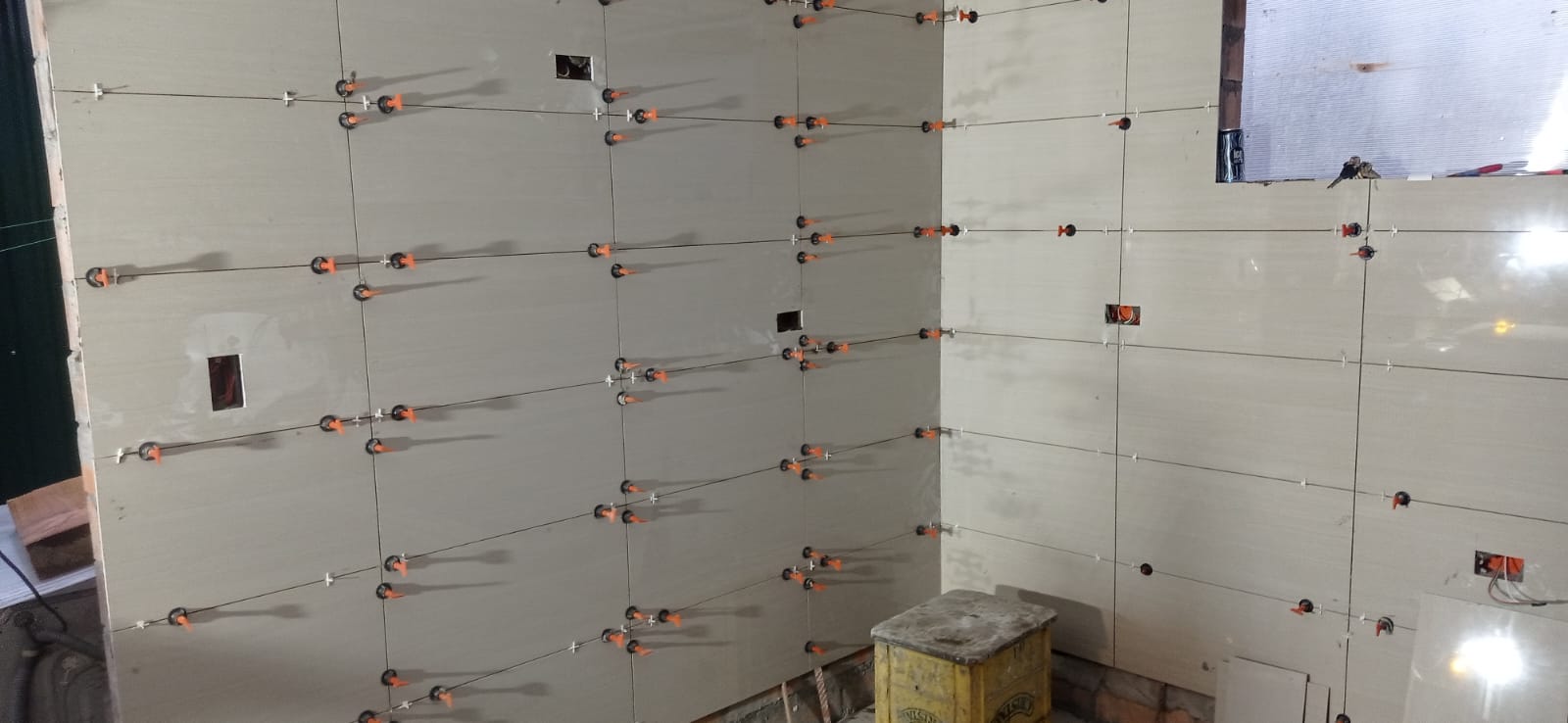 Instalación de porcelanato gris claro gran formato con niveladores rojos profesionales