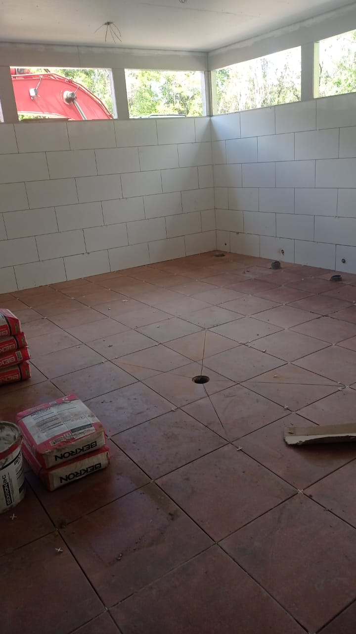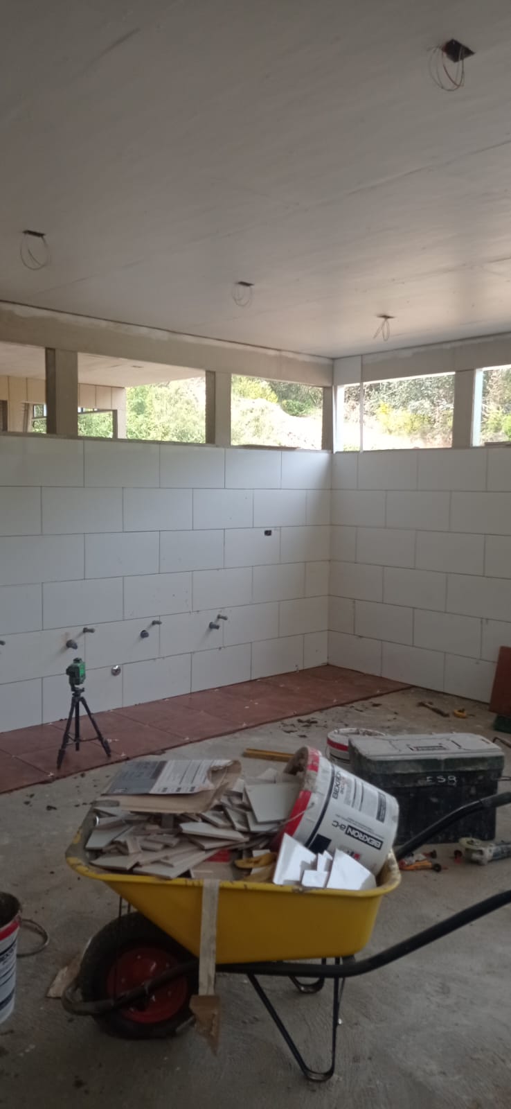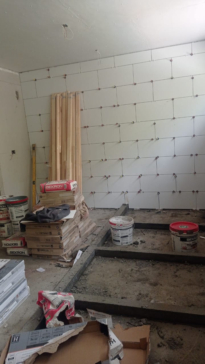 Baño con revestimiento blanco rectangular gran formato y piso beige en proceso