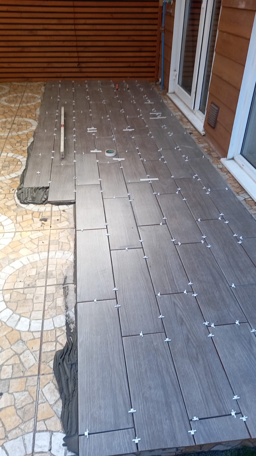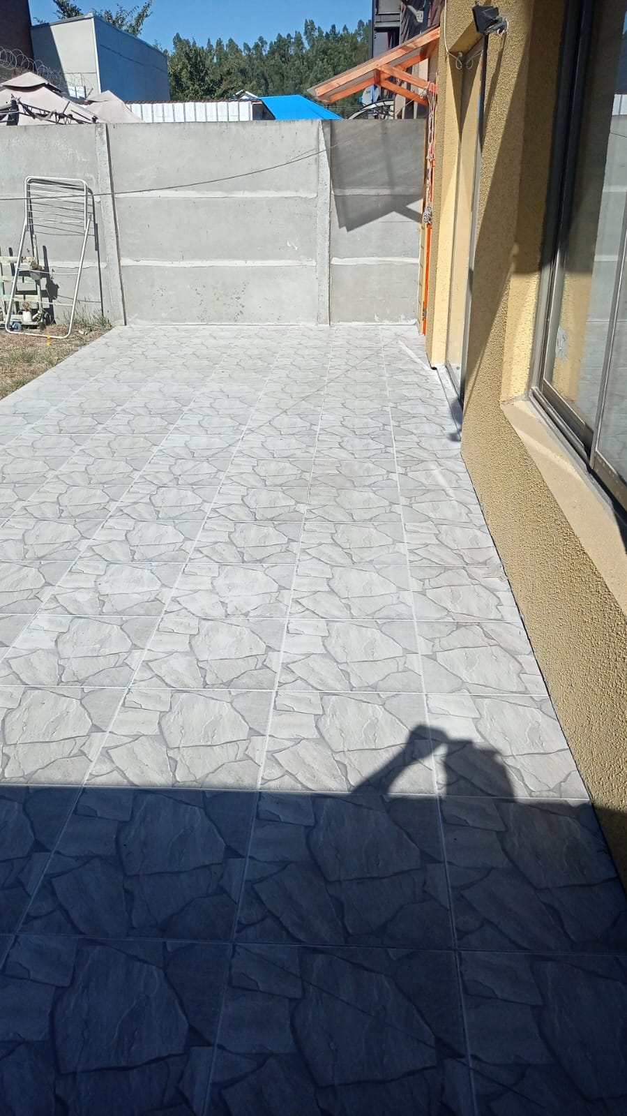Instalación de porcelanato gris en terraza cubierta con sistema de nivelación