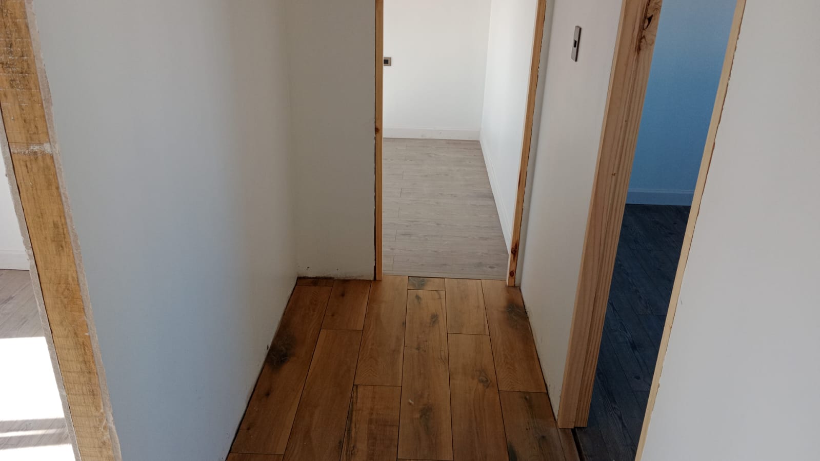 Pasillo interior con porcelanato símil madera beige y paredes blancas minimalistas