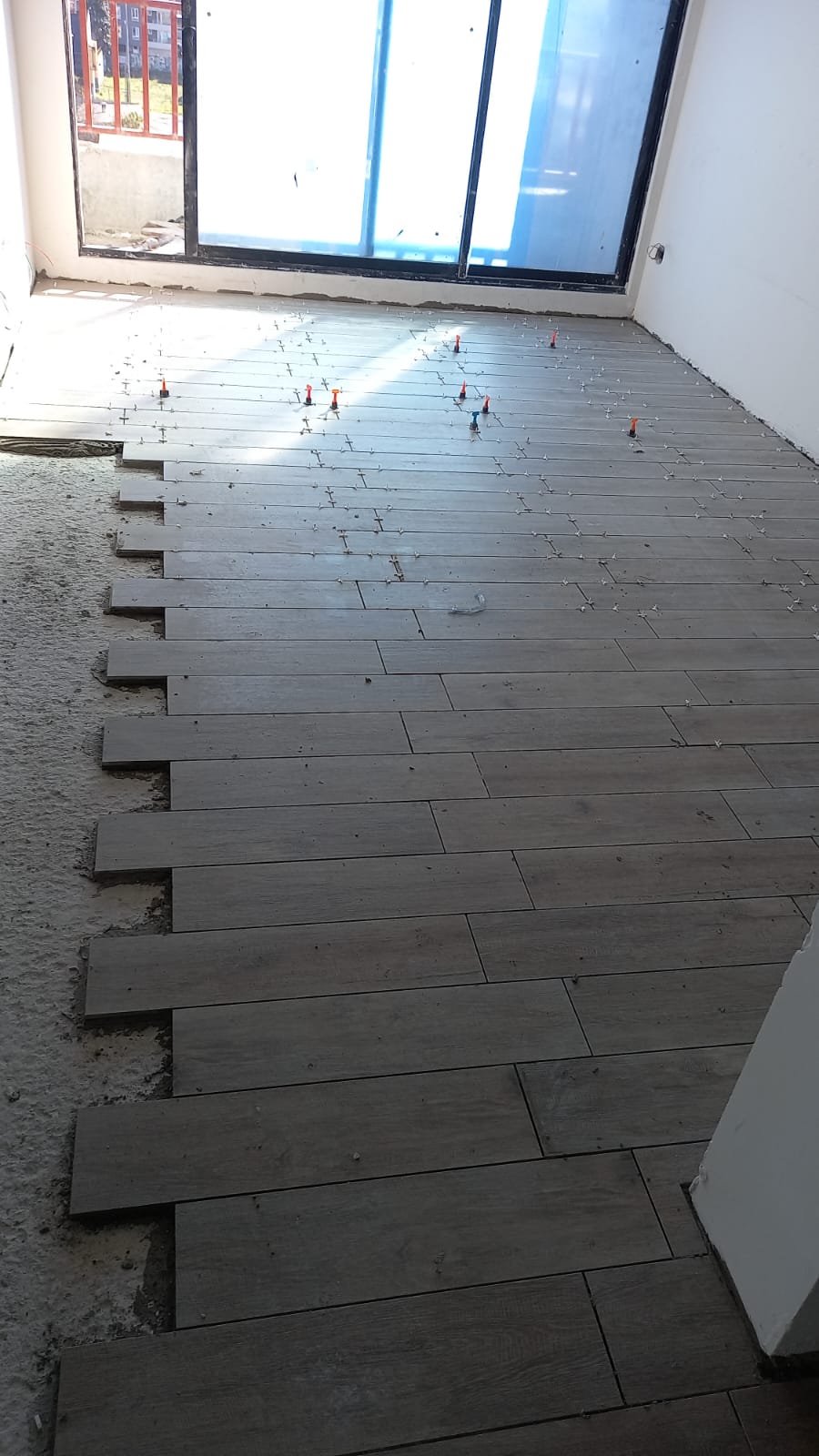 Porcelanato símil madera gris en patrón diagonal con niveladores profesionales